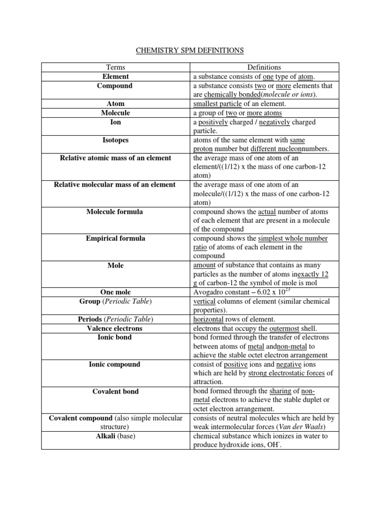 Chemistry Spm Definitions Pdf Molecules Atoms
